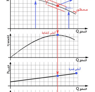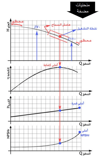 ثالثاً : انتقل للصفحات الداخلية لنفس الكتلوج للوصول إلى الصفحات التي تخص الموديلات المرشحة للاختيار، وعين مجدداً نقطة التشغيل الخاصة بك على منحنى HQ المضخة، وعندئذٍ وحتى تحكم على الموديل ما إذا كان هو المطلوب قم بفحص ما 1. هل وقعت نقطة التشغيل على منحنى HQ المضخة أ قريباً منها ضمن هامش سماح متماشي مع مواصفة ISO9906 Annex A، أي ضمن 7% علو و ± 9% تدفق مع ضرورة استبعاد المنطقة من بداية المنحنى ولغاية 10 من تدفق الكفاءة القصوى من حساباتنا وكذلك حافة الطرف الأيمن وأي منطقة يطلب منك المصنّع استبعادها كأن يشير إليها بخط رفيع أو متقطع لنقل في أغلب الحالات استهدف المنطقة الذهبية في منحنى HQ الواقعة بين 70 إلى 110 من قيمة تدفق الكفاءة القصوى.